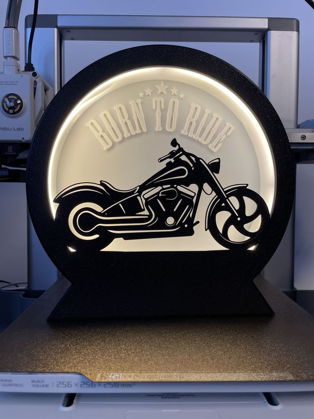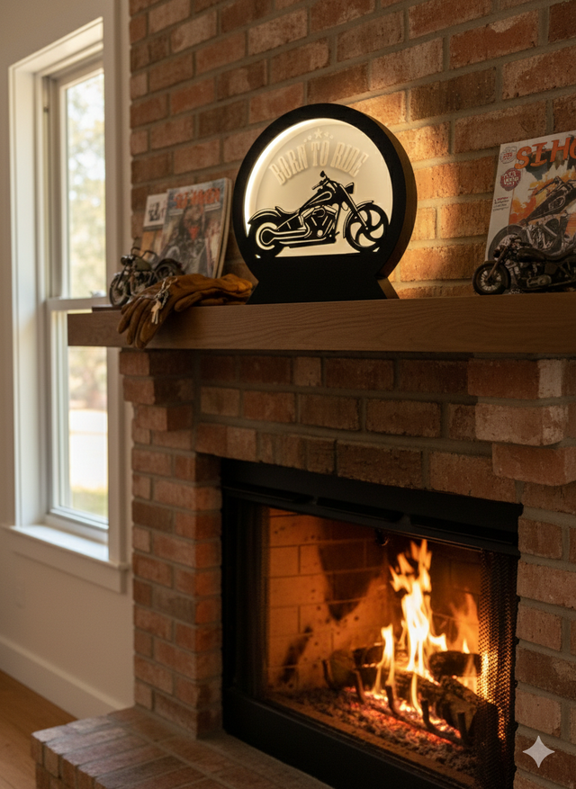 Diese LED-Ringlampe ist mehr als nur Deko – sie ist ein Statement. Der schwarze Motorrad-Silhouetten-Cutout vor dem hellen Hintergrund wird von einem warmweißen LED-Ring umleuchtet und setzt das Bike perfekt in Szene. Darüber prangt stolz der Schriftzug „BORN TO RIDE“ – ideal für alle, bei denen Benzin im Blut und Freiheit im Kopf steckt.
